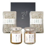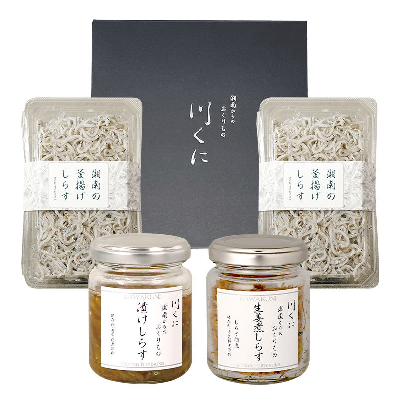 川くに4品セットは、漬けしらす、生姜煮しらす、いかの塩辛、釜揚げしらすから、お好きな商品2種と、釜揚げしらすパック×2個の4品セットです。